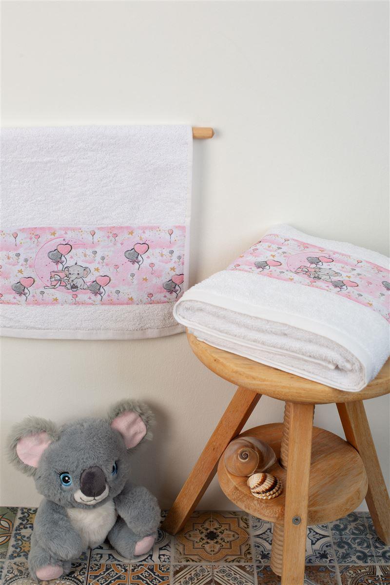 Σετ βρεφικές πετσέτες μπάνιου που περιέχει : 1 τεμάχιο πετσέτα χειρός διαστάσεων 30X50 cm και 1 τεμάχιο πετσέτα μπάνιου διαστάσεων 70X140 cm. Οι πετσέτες έχουν υφασμάτινη φάσα με ψηφιακά τυπωμένα χρωματιστά σχέδια και είναι κατασκευασμένες από 100% βαμβάκερη πετσέτα 400 gsm, υψηλής απορροφητικότητας. Συσκευασία Δώρου Κουτί Πολυτελείας.
