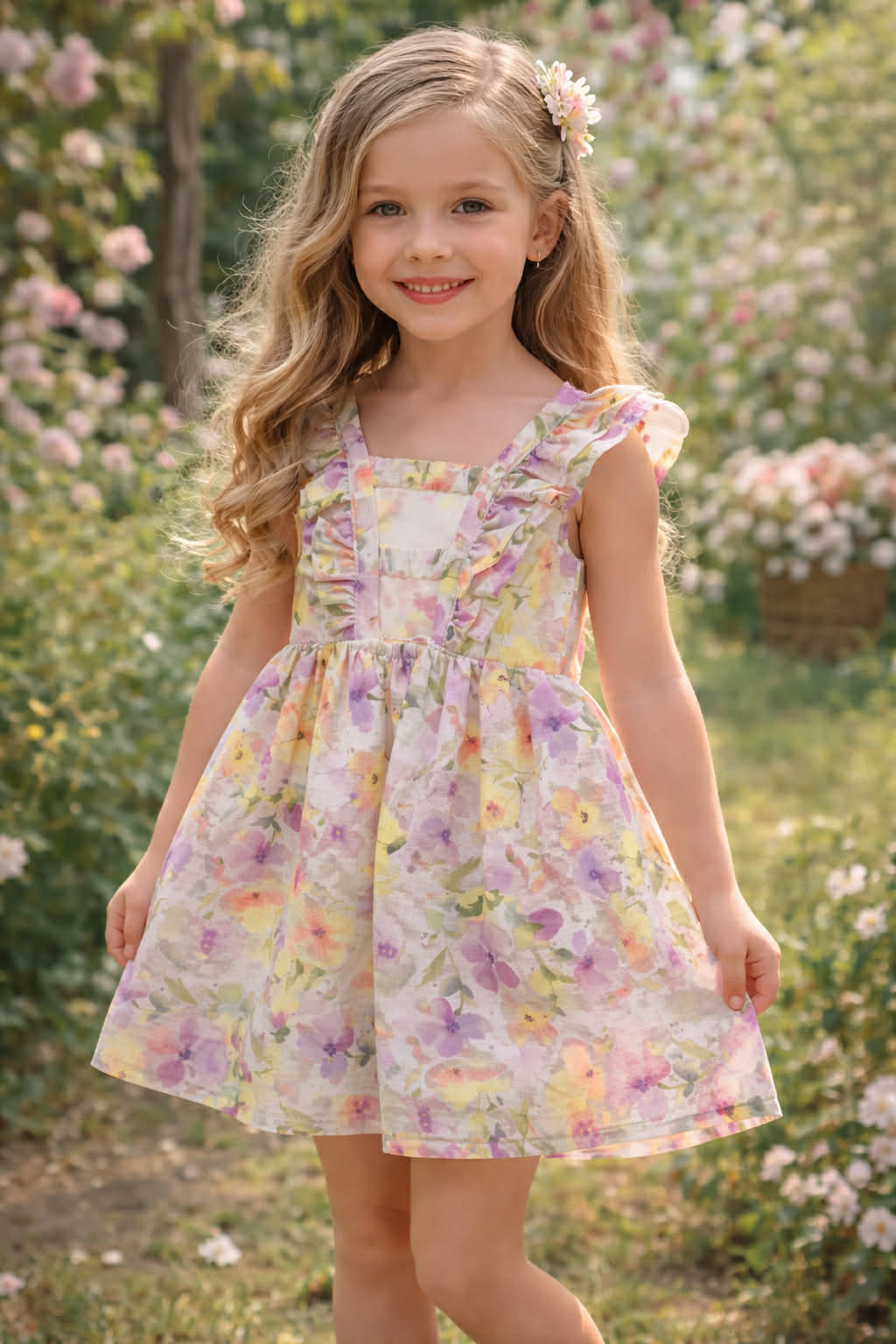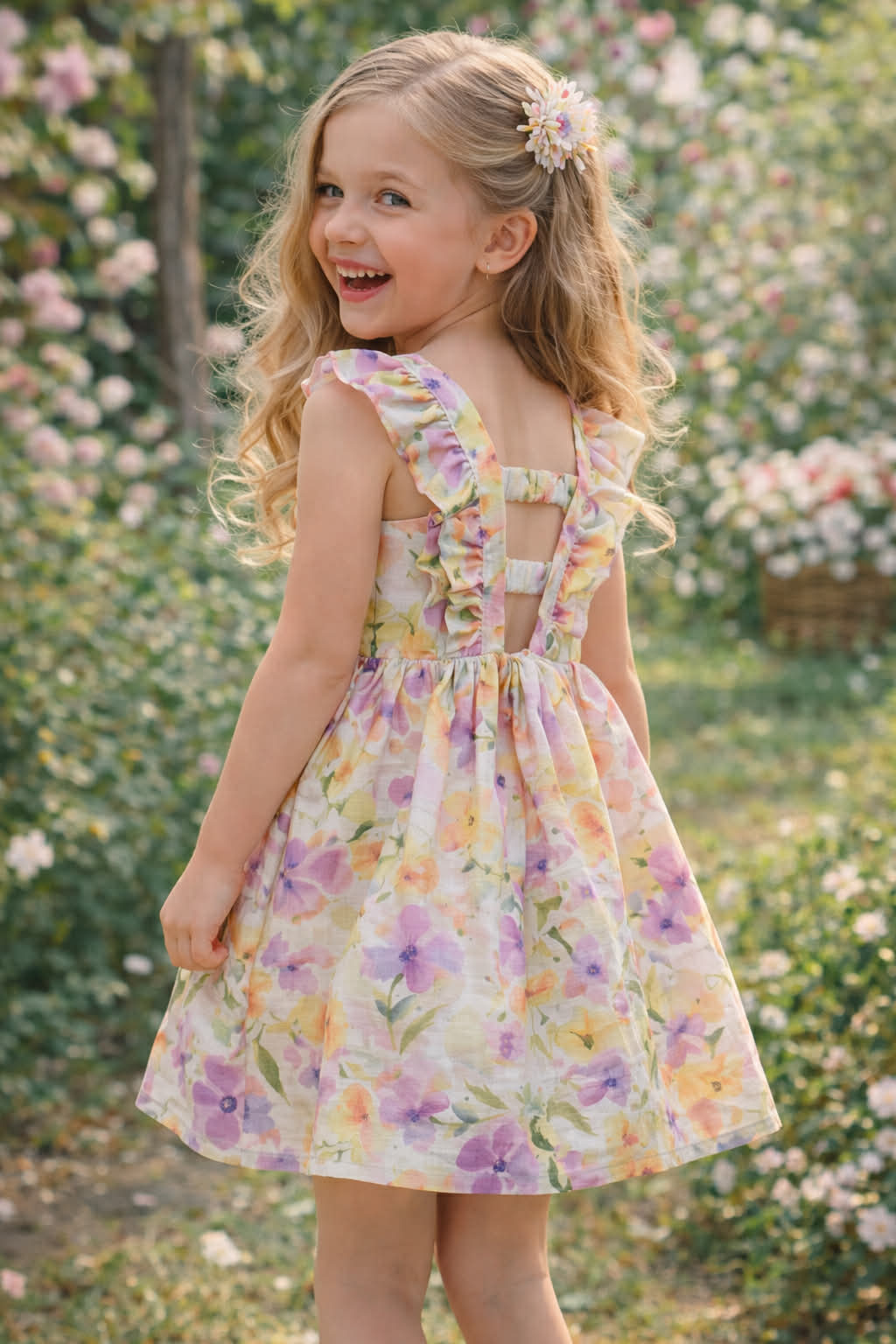 Παιδικό φόρεμα αμάνικο με βολάν σε χρώμα εμπριμέ λιλά. Διαθέτει λάστιχο στο πίσω μέρος και ανοιχτή πλάτη.